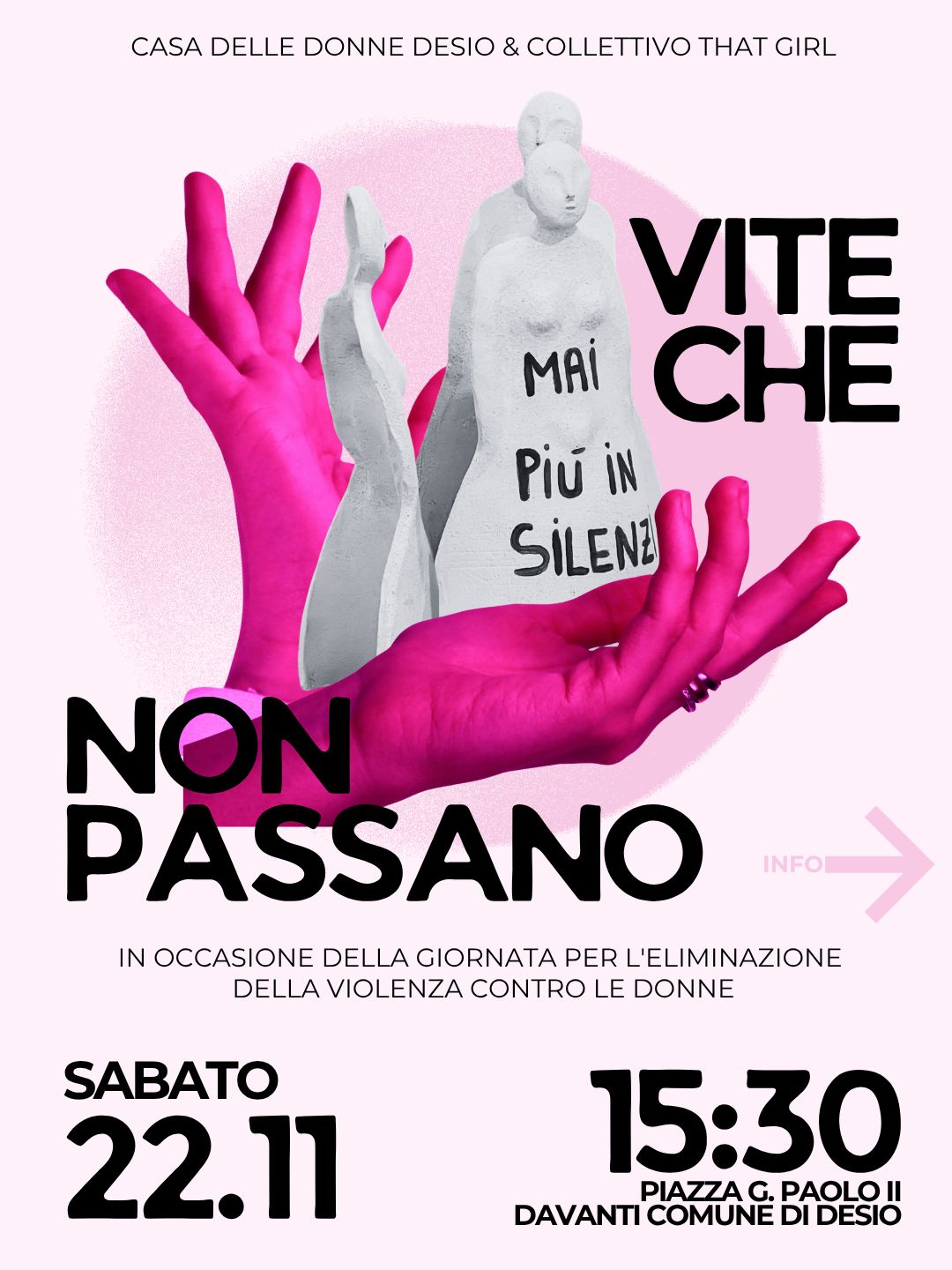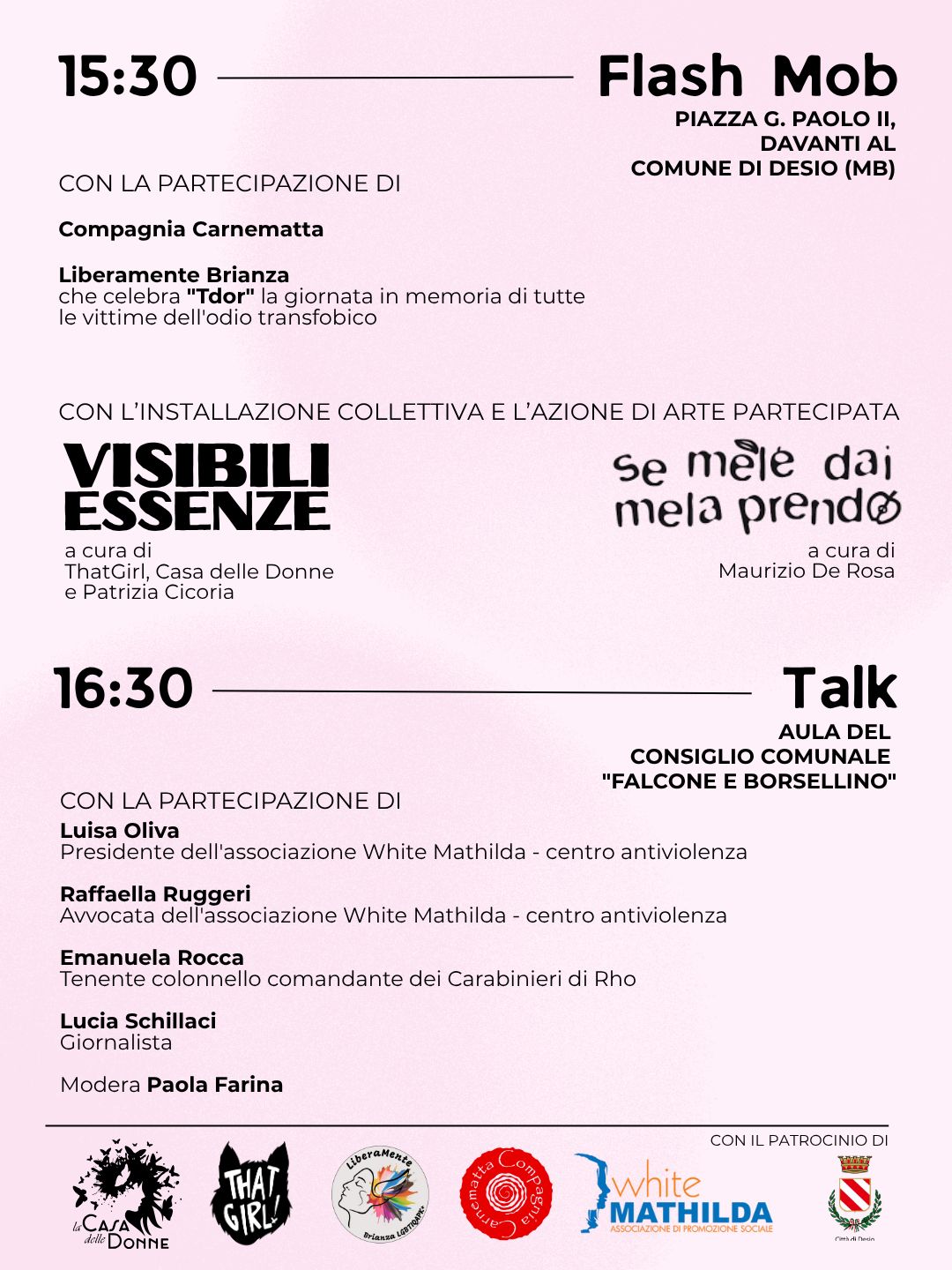 - Sabato 22 novembre: ore 15:30 davanti al Comune in piazza Giovanni Paolo II, a cura dell’APS Casa delle Donne di Desio: flash mob dal titolo "Vite che non passano"; a seguire, in Sala Consiliare, tavola rotonda sul tema della violenza di genere, con la partecipazione dell'associazione White Mathilda;
