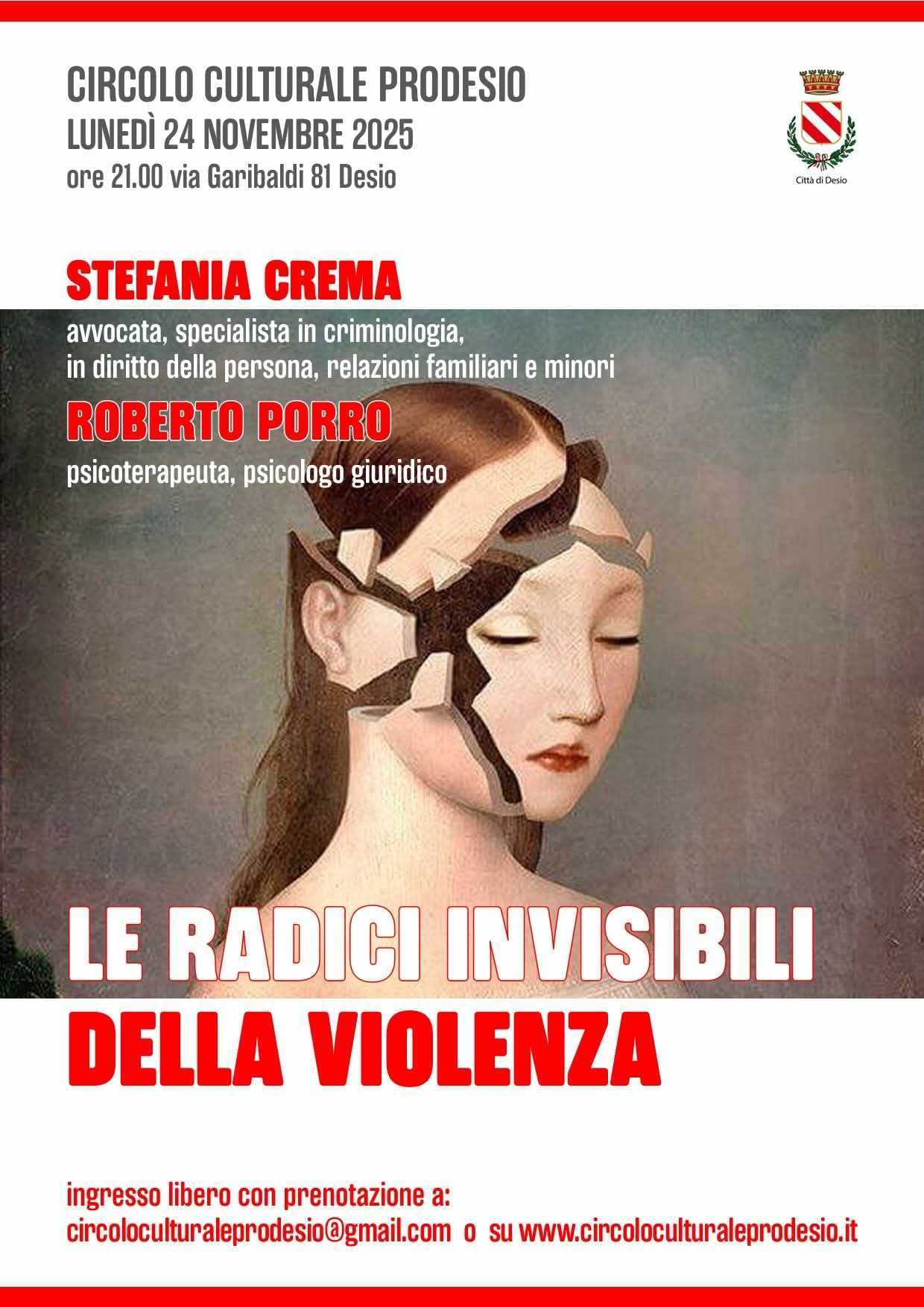 - Lunedì 24 novembre: alle ore 21:00 presso la Sala Manzotti, a cura del Circolo Culturale Pro Desio, serata dedicata al tema della violenza di genere con psicologi, pedagogisti e altre professionalità;