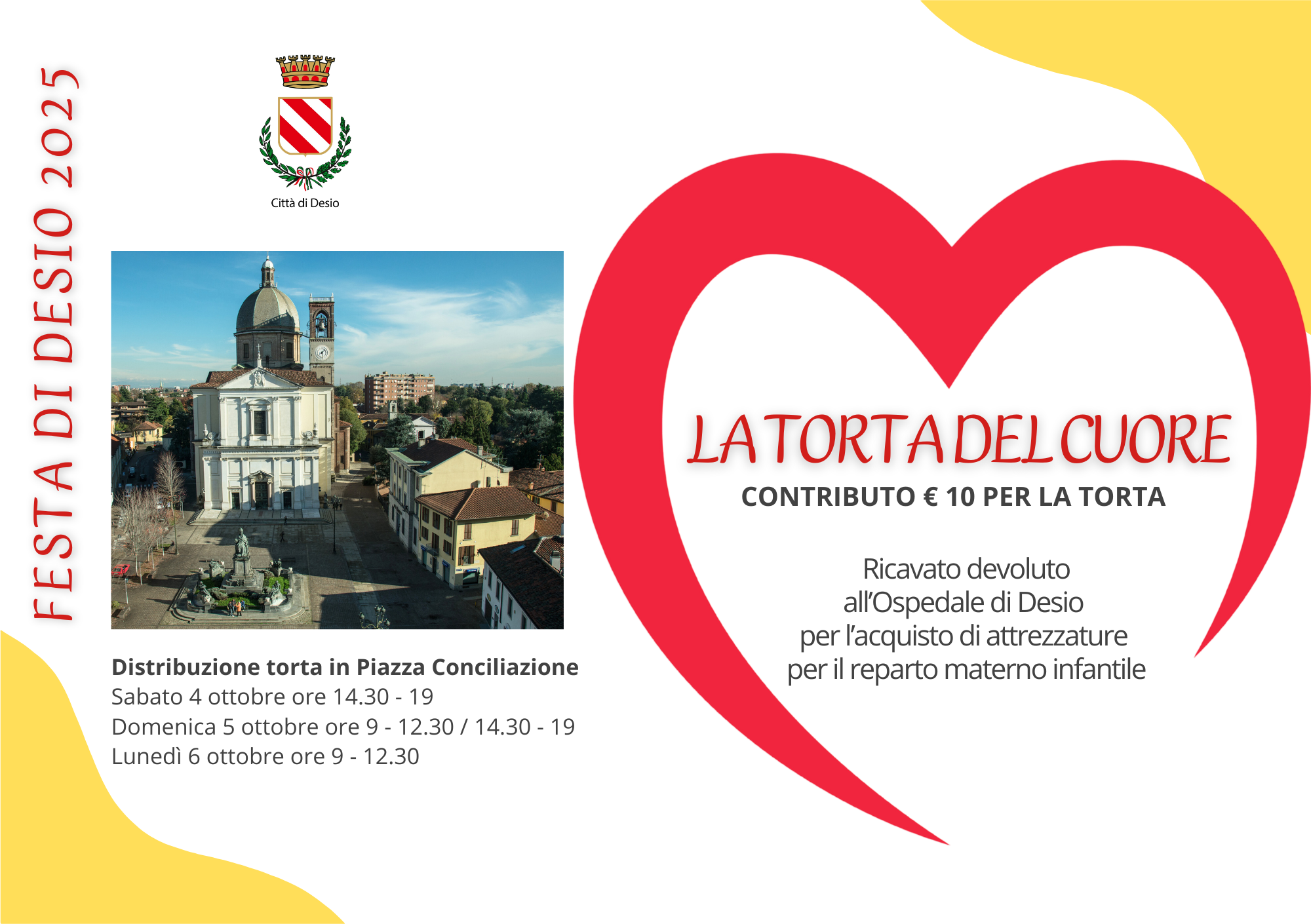 E’ partita la prevendita dei biglietti della Torta del Cuore targata 2025 (a cura delle associazioni Pro Loco Desio, Bocciofila Parco, Cannisti Muggiò e altre associazioni di volontariato del territorio), l’iniziativa che ogni anno accompagna la Festa di Desio: un contributo di 10 euro il cui ricavato, al netto delle spese, sarà devoluto all'Ospedale Pio XI di Desio per l'acquisto di attrezzature sanitarie da destinare al reparto materno infantile.