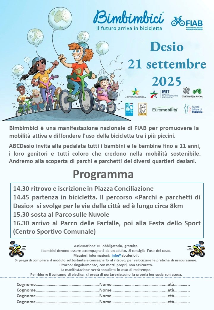 Nel programma si inserisce anche l'iniziativa BIMBIMBICI, la manifestazione nazionale di FIAB per promuovere la mobilità attiva e diffondere l'utilizzo della bicicletta tra i piu' piccini. L'Associazione ABCDesio invita tutti i bambini sino a 11 anni con le loro famiglie a partecipare a una pedalata alla scoperta di parchi e parchetti nei Quartieri della città, con ritrovo e iscrizione in piazza Conciliazione alle ore 14.30. Arrivo previsto indicativamente alle 16.30 al Parco delle Farfalle.