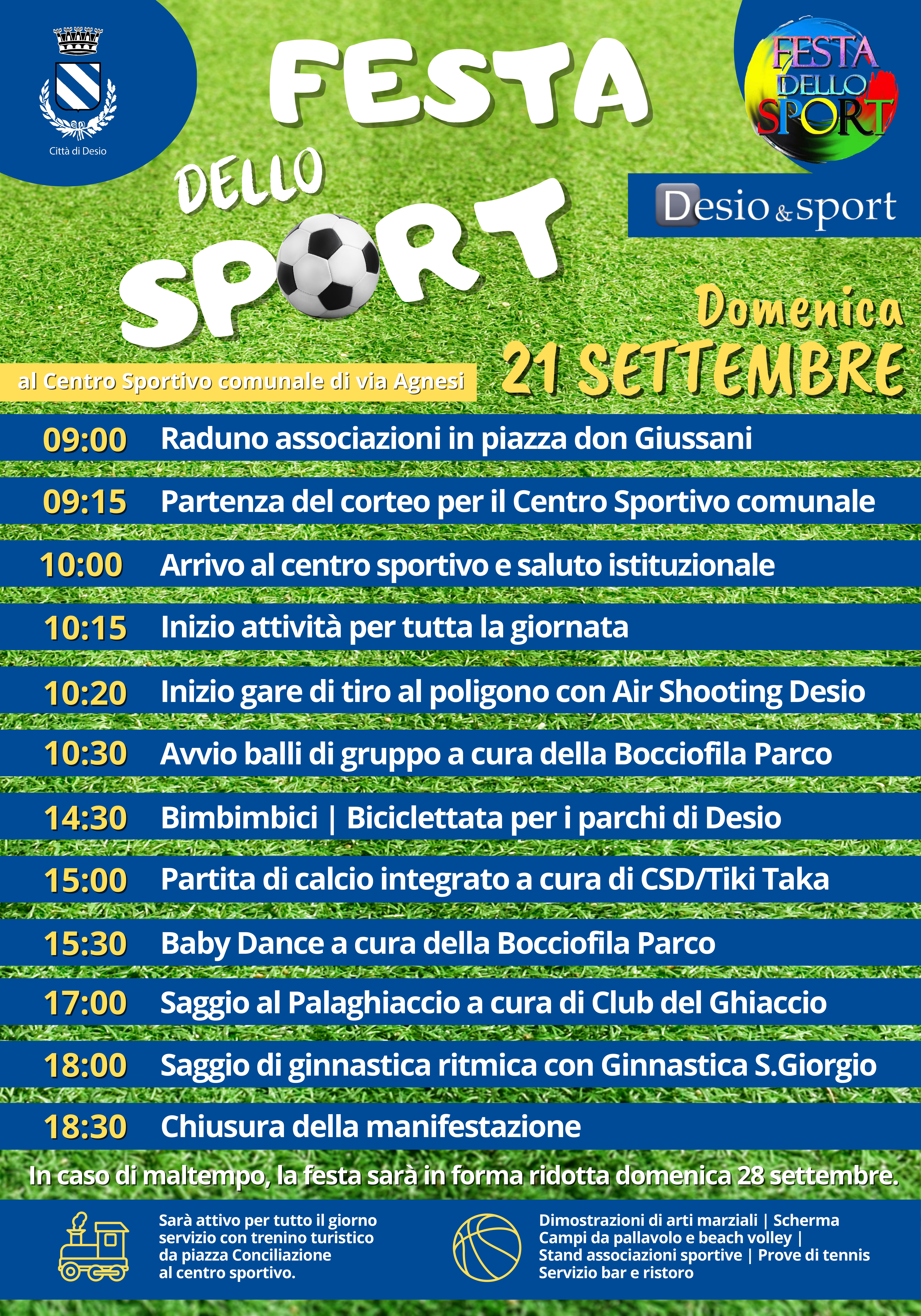 Torna a settembre l’appuntamento per associazioni sportive e famiglie: a Desio sta per partire la tradizionale Festa dello Sport, la manifestazione organizzata in collaborazione con il Comitato Sport Desio e l’Assessorato allo Sport, in programma domenica 21 settembre 2025 presso il centro sportivo comunale di via Agnesi. Protagoniste saranno tutte le società e Associazioni sportive del territorio che offriranno un’ampia vetrina delle discipline sportive e metteranno a disposizione proprio personale e materiale informativo nei gazebo allestiti in loco.