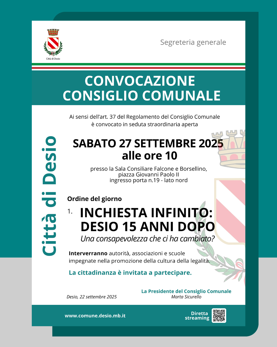 L’evento dal titolo ‘Inchiesta Infinito: Desio 15 anni dopo – Una consapevolezza che ci ha cambiato?’ è in programma sabato 27 settembre a partire dalle ore 10 presso la sala consiliare intitolata ai Giudici ‘Falcone e Borsellino’, simbolo tangibile di legalità, in piazza Giovanni Paolo II (ingresso porta 19, lato nord).