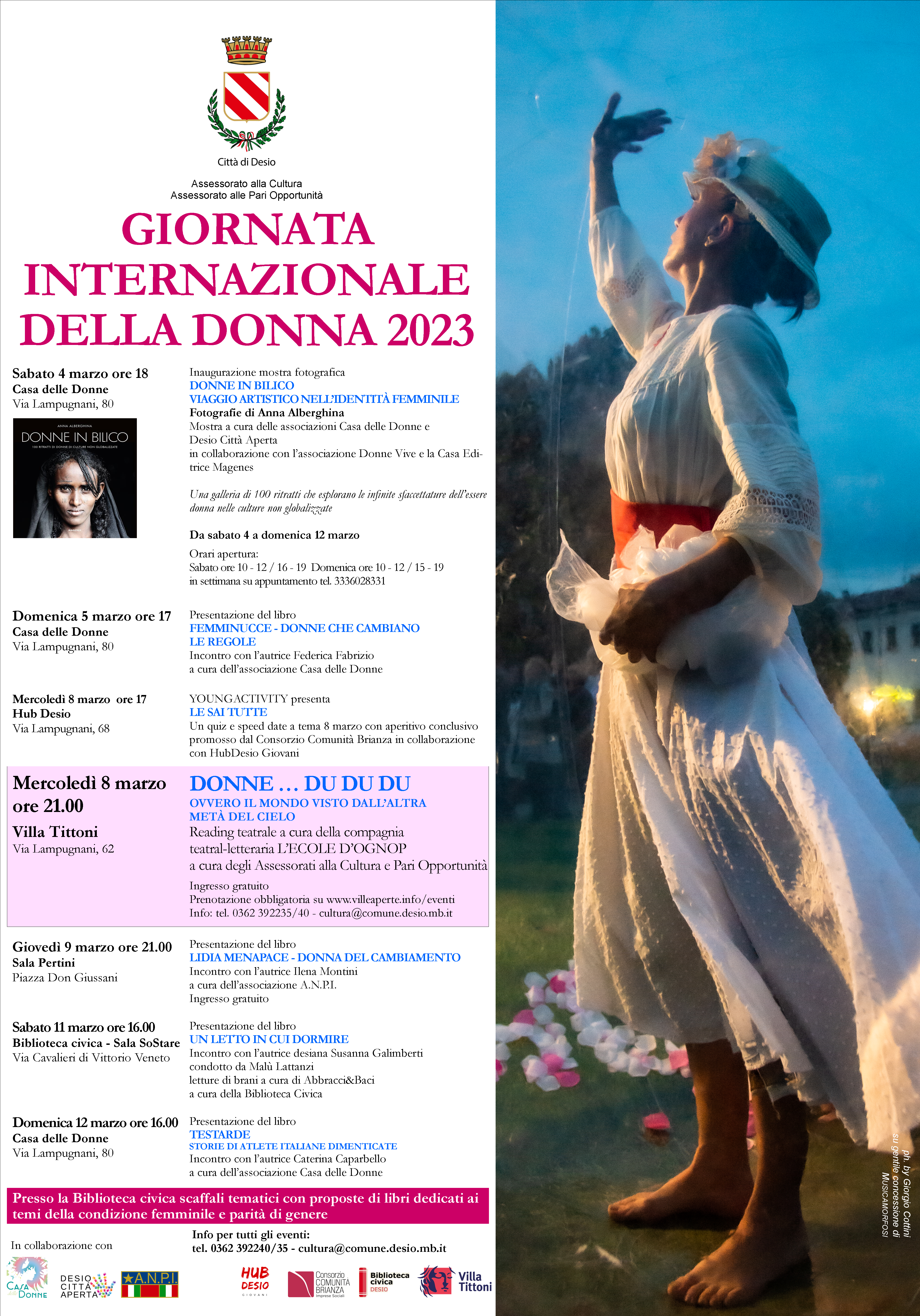 Saranno 7 gli appuntamenti dedicati al mondo femminile, realizzati grazie alla consueta collaborazione di qualche Associazione desiana attivamente coinvolta. Protagonista sarà la figura femminile, valorizzata e celebrata attraverso ogni forma artistica e culturale: fotografia, teatro, arte e letteratura.