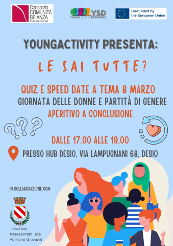 PER I GIOVANI. Youngactivity presenta: ‘LE SAI TUTTE'?, un quiz e speed date a tema 8 marzo, un’iniziativa che rientra nel progetto Young Service Design, di cui Consorzio Comunità Brianza è Capofila e il Comune di Desio è partner. L'evento si terrà mercoledì 8 marzo, dalle 17 alle 19, presso Hub Desio, in via Lampugnani 68, con aperitivo conclusivo.