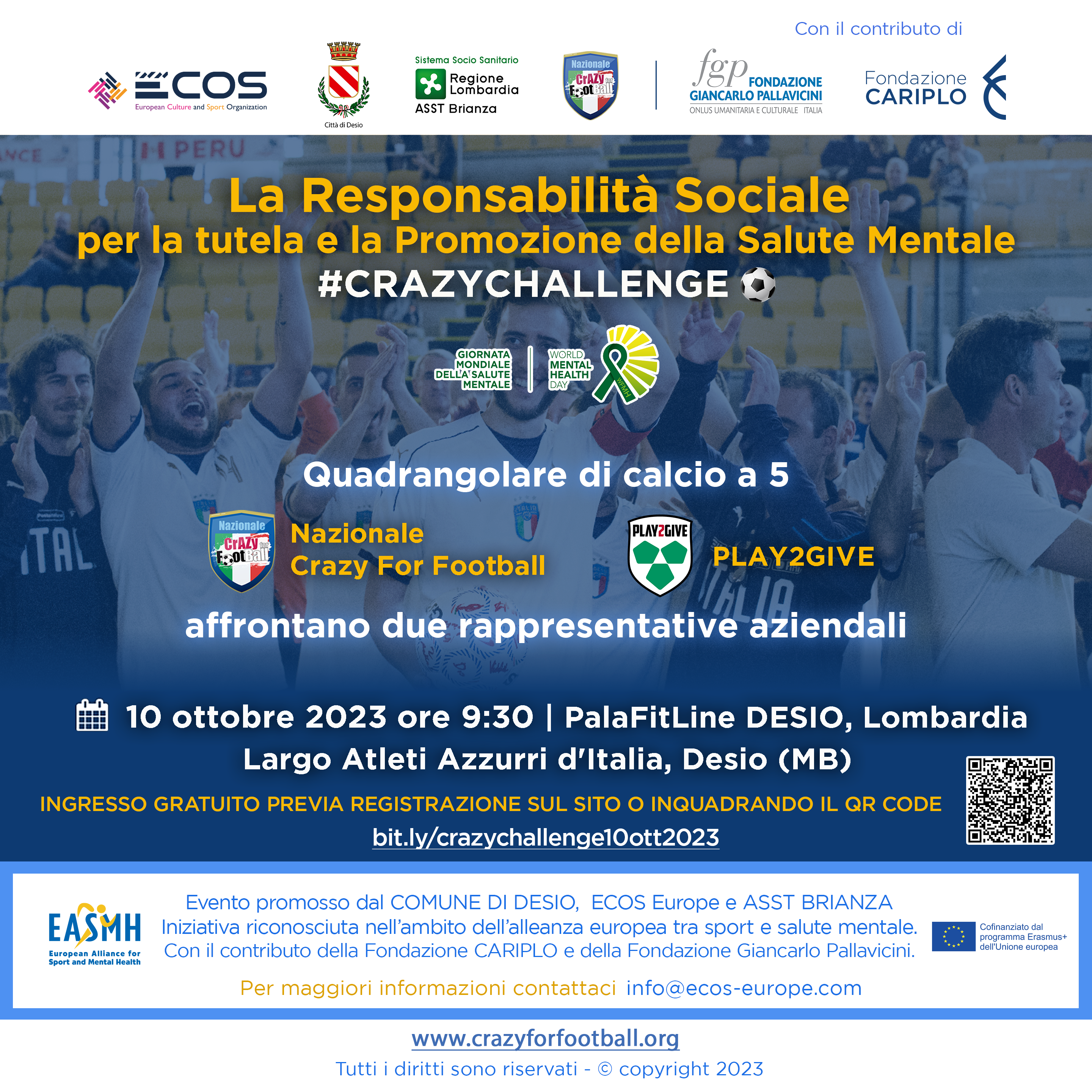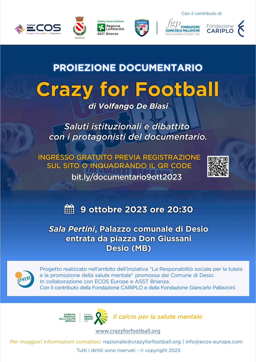 Crazy for Football” - Il calcio per la salute mentale, contro lo stigma e a sostegno dell'inclusione. Un documentario del 2016, diretto da Volfango De Blasi, vincitore di un David di Donatello per il miglior film. Al termine della proiezione sarà offerto un aperitivo. Ingresso gratuito con