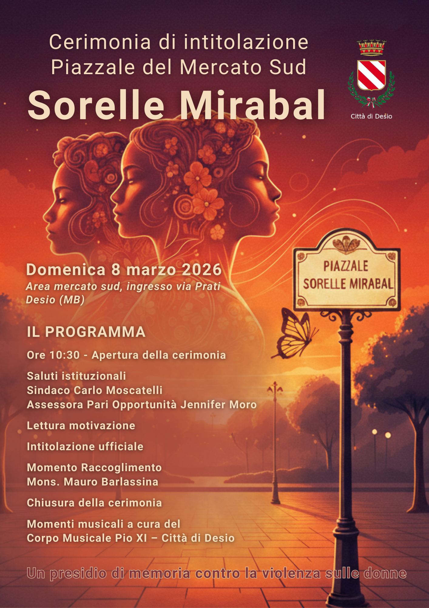 "A Patria, Minerva e Maria Teresa Mirabal, le 'Farfalle' il cui volo fu spezzato dalla mano brutale della tirannia, ma il cui battito d’ali risuona ancora oggi come un grido di libertà. L’Amministrazione di Desio dedica loro questo spazio affinché non sia solo un luogo di passaggio, ma un terreno di memoria viva. Ogni passo su queste pietre sia un impegno solenne: quello di non voltarsi mai dall'altra parte di fronte alla violenza, di nutrire il rispetto come l'aria che respiriamo e di consegnare ai nostri figli un mondo dove nessuna donna debba più pagare con la vita il desiderio di essere libera."