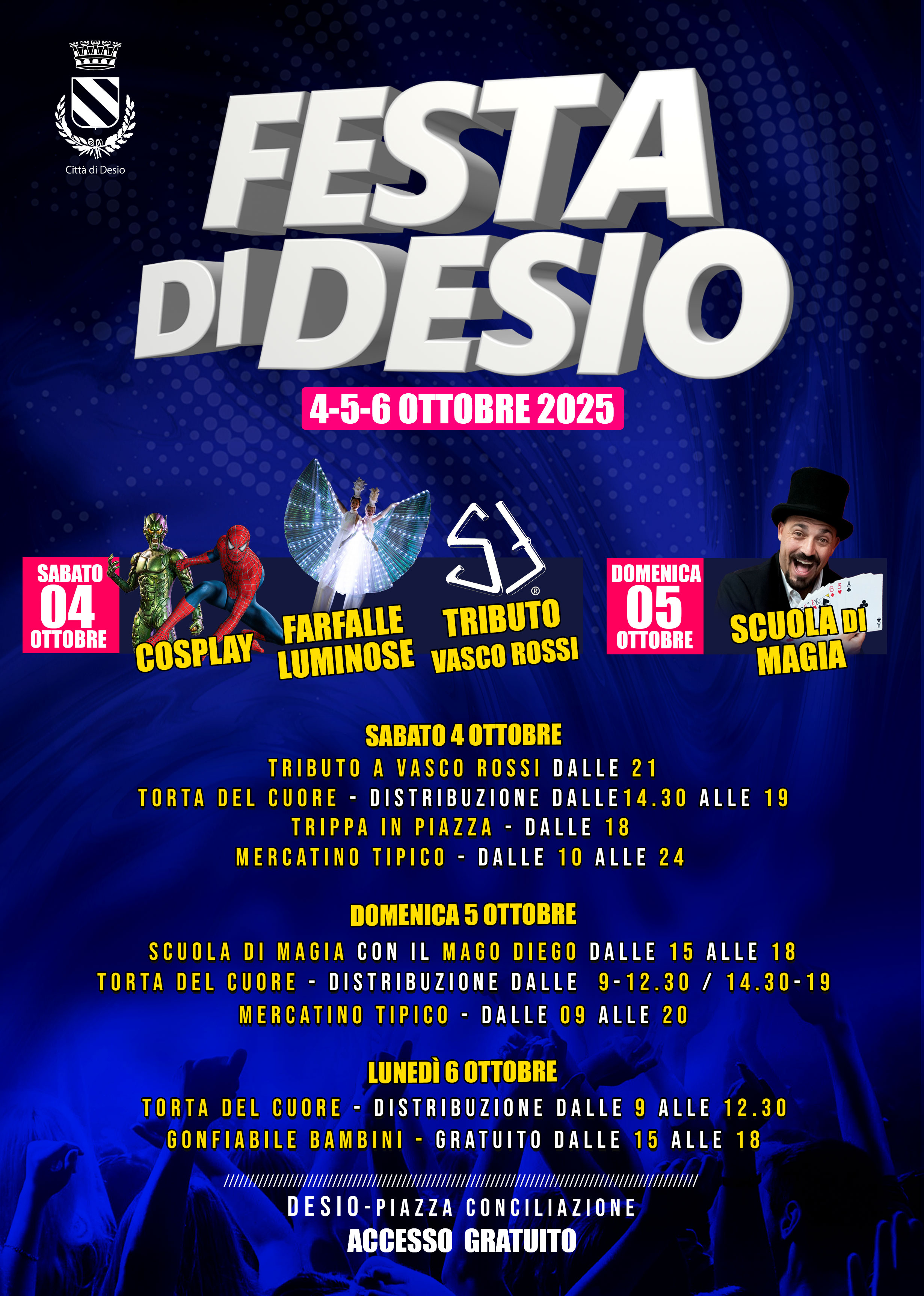 • In piazza Don Giussani dalle 9 alle 13 si terrà l’evento “1995/2025 - 30 anni al servizio di Desio” a cura del Gruppo comunale di Protezione Civile: benedizione dei mezzi, dimostrazione di scenari di Protezione Civile, saluti istituzionali, consegna degli attestati e distribuzione di palloncini per i piu’ piccoli;